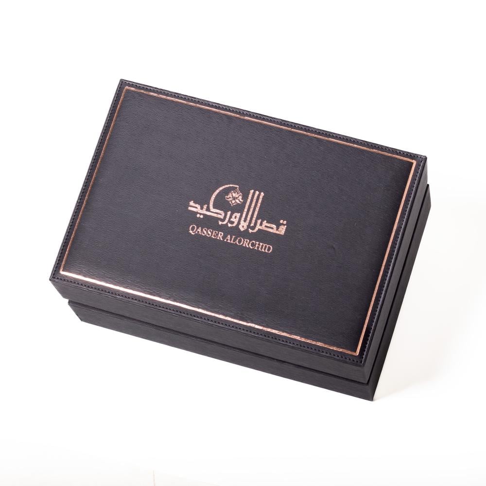 صندوق فاخر بتصميم أنيق يعكس جمال التفاصيل، مقدم من "قصر الأوركيد". مثالي كهدية تعبر عن الذوق الرفيع والرقي العربي.